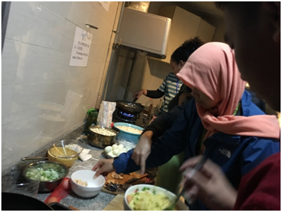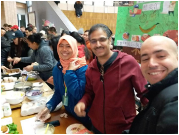 29日当天,各位大厨和他们的助理中午就开始在厨房忙活开了。一班员工准备了老挝、巴基斯坦、菲律宾等国的风味美食,二班员工马克做甜甜圈,印尼的爱玛做鸡蛋千层面,印尼的赛图做土豆饼。沙特警察巴迪的妻子友情赞助,为警察班做鸡肉饭。物美价廉,销售火爆。