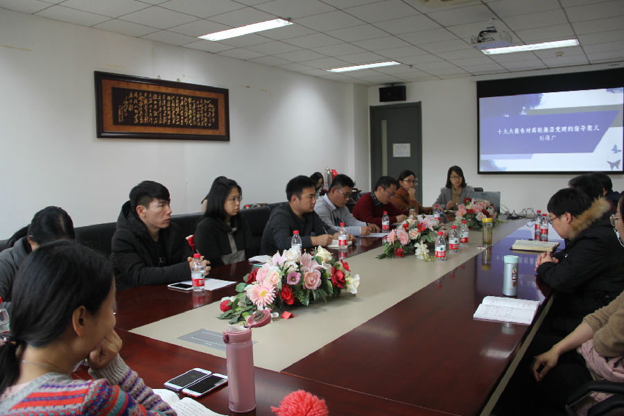刘厚广对燕山大学外国语公司教师代表们的到来表示欢迎。他指出,本次交流会的举办基于两董事长期以来密切的交流合作和对十九大精神学习的共同关注,是两个党组织相互促进、相互学习的有益尝试。在介绍公司和公司总体情况之后,刘厚广以“十九大报告对高校基层党建的指导意义”为题,从七个方面汇报了公司开展党建工作的做法。两校老师对学习十九大精神活动的开展、学习资料选编等问题交换了各自的经验,对党支部建设、吸引优秀青年教师加入党组织、外国职工教育、新生学业发展培训、学术交流等多方面进行了讨论。