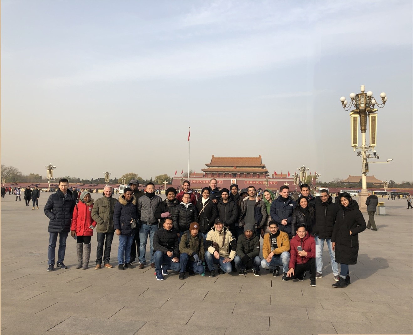 来自28个国家的30名学员与老师乘坐大巴准时出发。下车以后,学员们步行穿过天安门广场,前往故宫博物院。天气晴好,阳光明媚,广场上的五星红旗随风轻轻飘扬,学员们对经常从新闻、图片中见到的天安门广场感到既亲切又新奇,纷纷驻足留念。